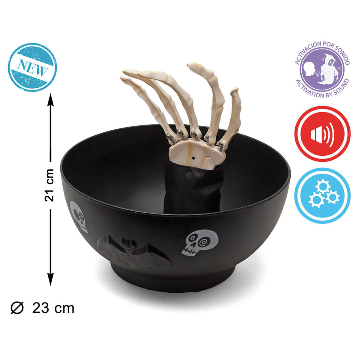 Liikeohjattu Halloween-koriste, joka yhdistää liiketunnistimen, äänen ja liikkuvan luurankokäden pelottavaksi pöytä- tai ovekohokseksi. Musta muovikulho toimii näyttävänä karkki- tai koristekulhona halloween-juhliin ja kauhuteemaiseen sisustukseen.
