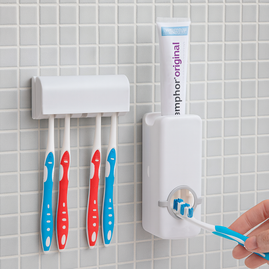 Seinään kiinnitettävä hammastahnan annostelija ja hammasharjateline pitää kylpyhuoneen siistinä ja annostelee tahnan yhdellä painalluksella. Hygieeninen säilytys vähentää kosketusta ja vapauttaa tasotilaa.