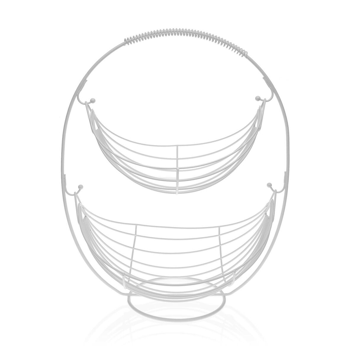 Valkoinen metallinen 2-tasoinen hedelmäkulho, suunniteltu tilan säästämiseen ja helppoon hedelmien säilytykseen keittiössä. Tyylikäs ja ilmava malli pitää hedelmät näkyvissä ja ilmassa, mikä edistää tuoreutta ja antaa selkeän ilmeen keittiön tasolle.