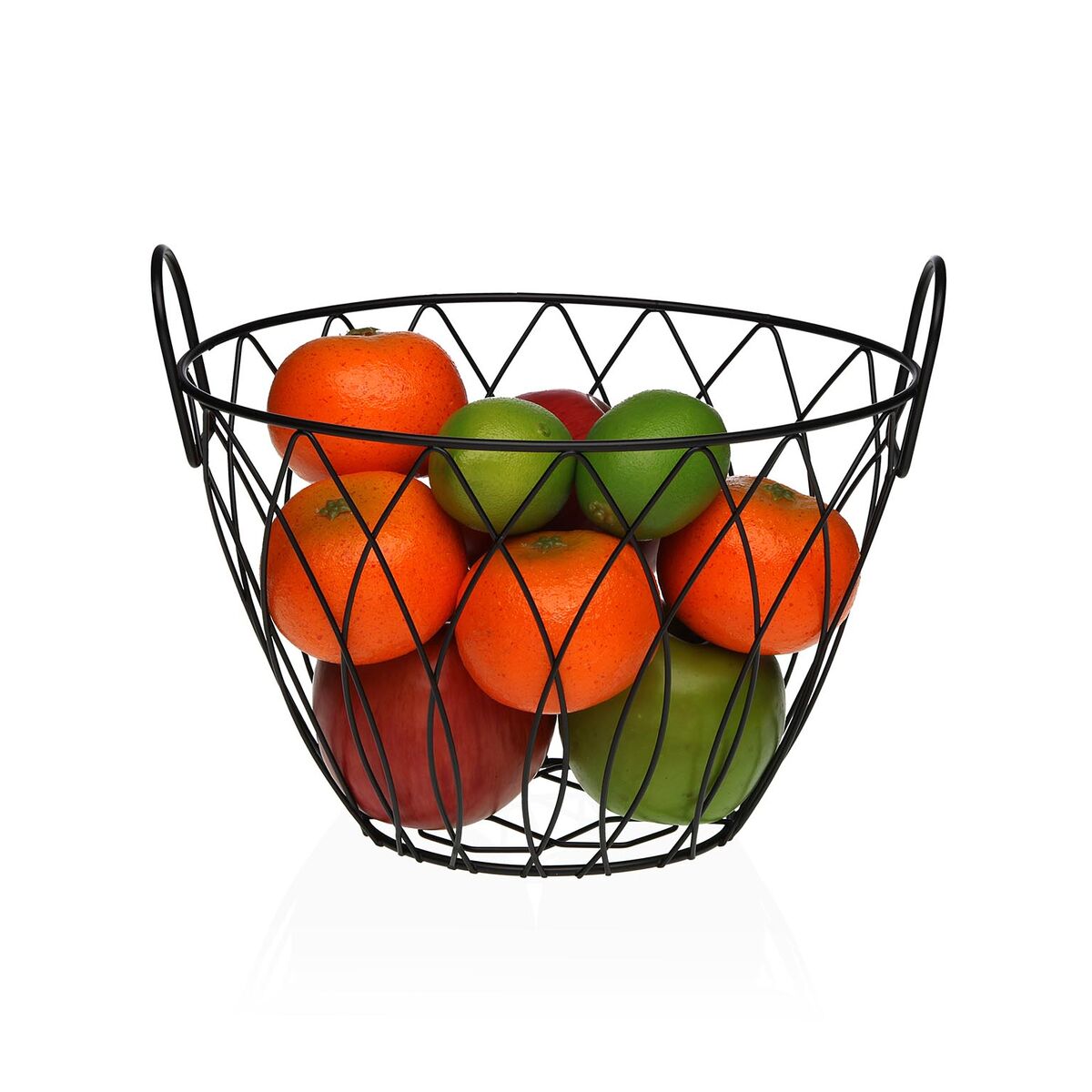 Tyylikäs musta teräshedelmäkulho, ovaali metalliverkko ja kätevät sivukahvat. Sopii hedelmien, vihannesten ja koristetavaroiden säilytykseen keittiössä tai ruokapöydällä.