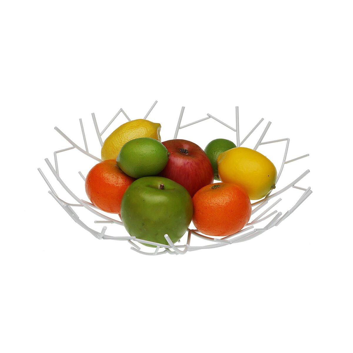 Valkoinen hedelmäkulho teräksestä, oksamaisella ja ilmavalla verkkomaisella muotoilulla. Moderni koristekulho ja käytännöllinen säilytysratkaisu hedelmille, leivälle tai tarjottaville.