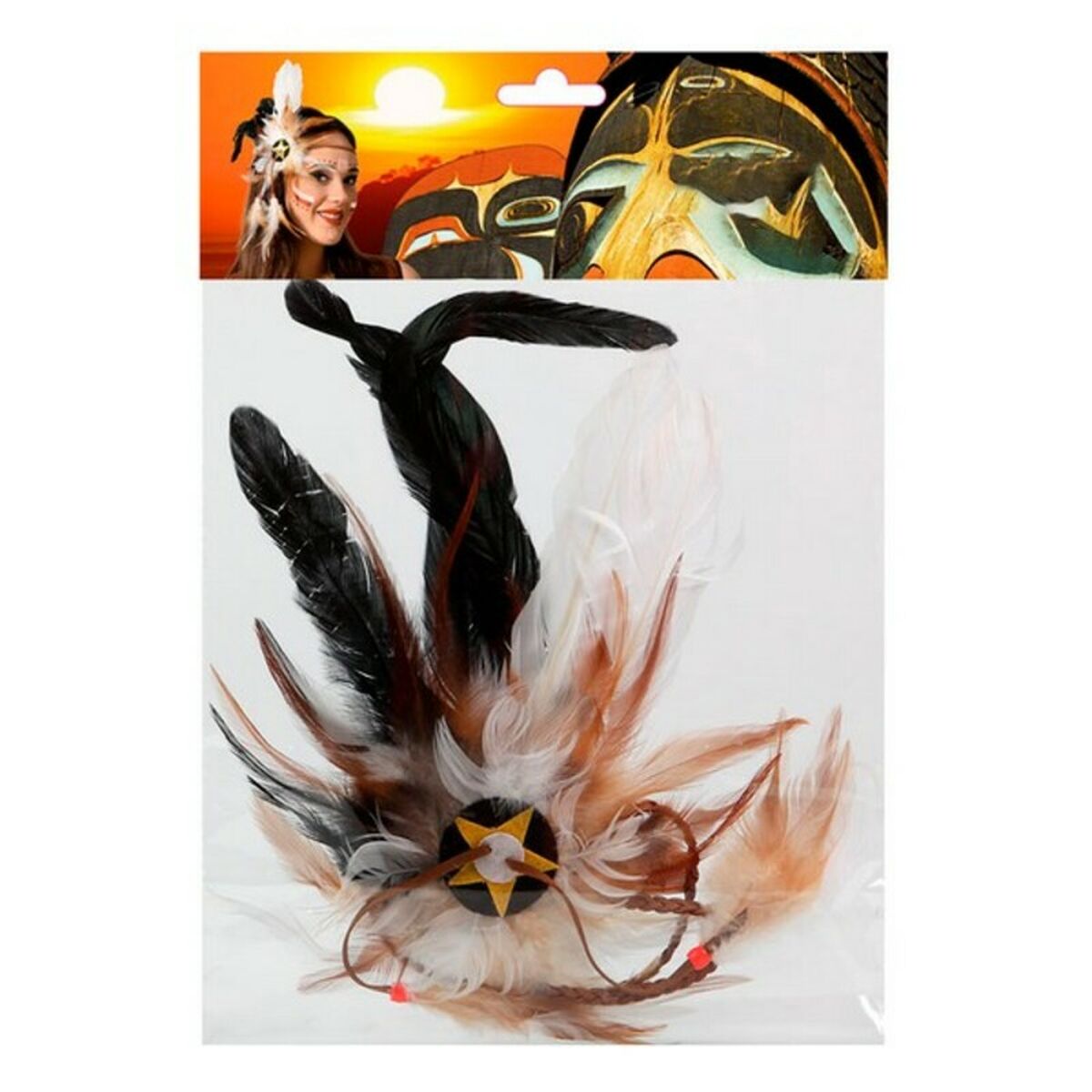 Intiaanipäähine sulkakoriste, ruskea polyesteri, musta nauha, juhliin naisille