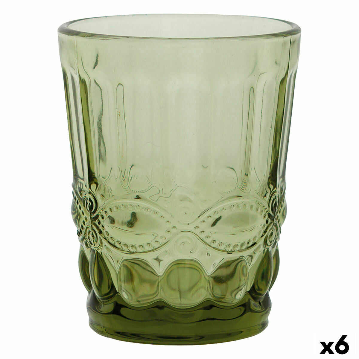 Tyylikkäät vihreät lasiset juomalasit, tilavuus 260 ml (26 cl). Koristeltu kohokuviointi luo retrohenkisen ilmeen ja sopii arkeen sekä juhlakattauksiin.