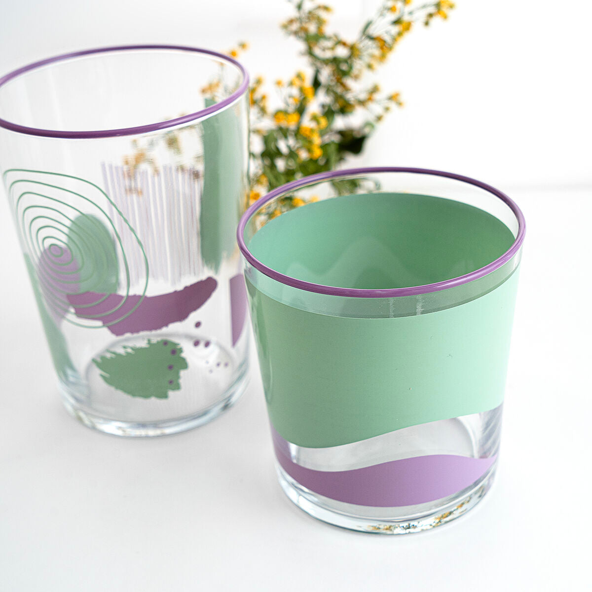 Hakusanoja: juomalasit 380 ml, lasiset juomalasit 6 kpl, monivärinen lasi, abstrakti kuosi, juomalasi keittiöön