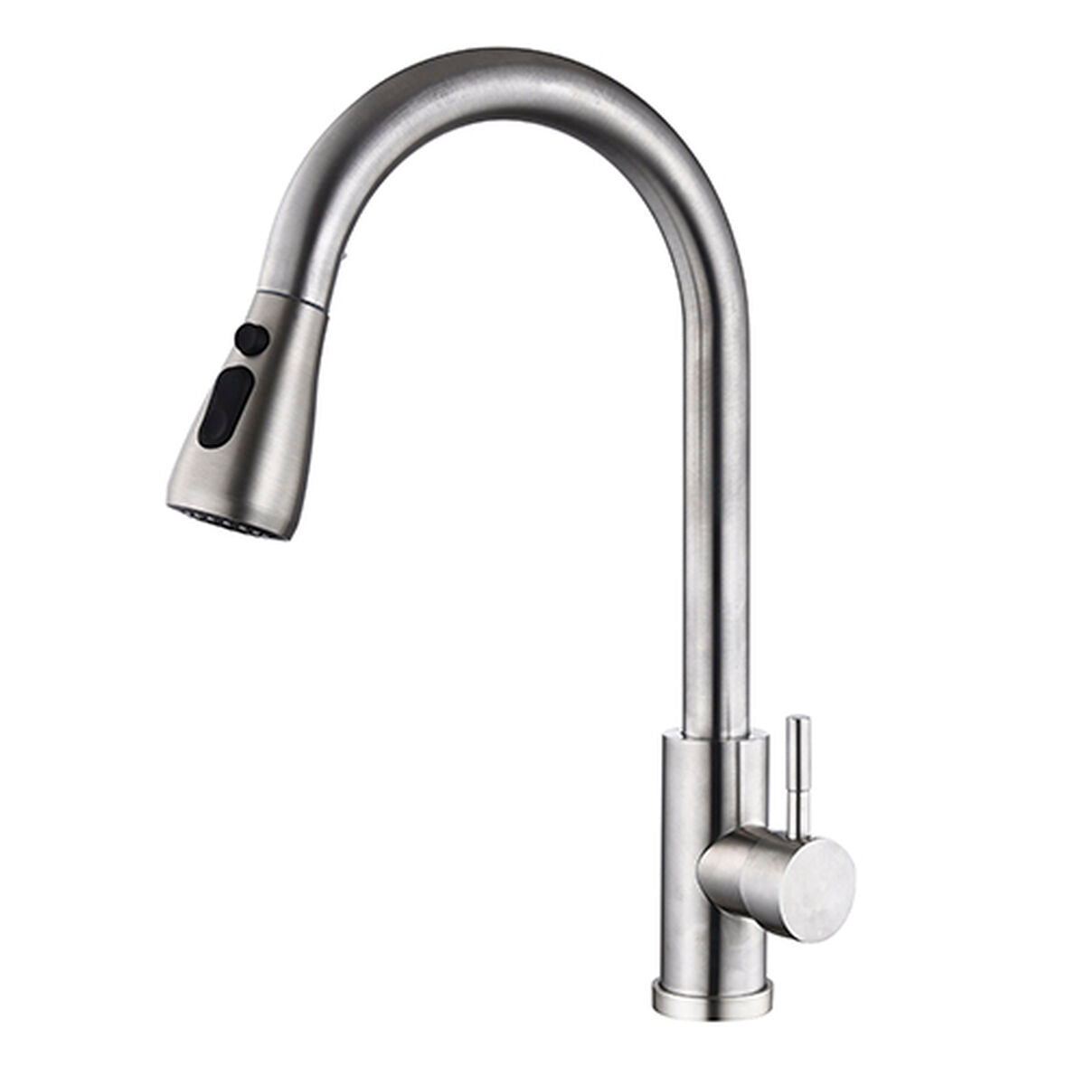 Moderni C-muotoinen keittiöhana harmaalla ruostumattomalla teräsviimeistelyllä. Varustettu keraamisella kasetilla, ulosvedettävällä suihkupäällä ja 360° kääntyvällä kaulalla, sopii tiskialtaaseen ja keittiöremontteihin.