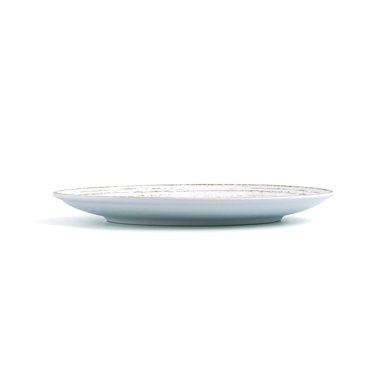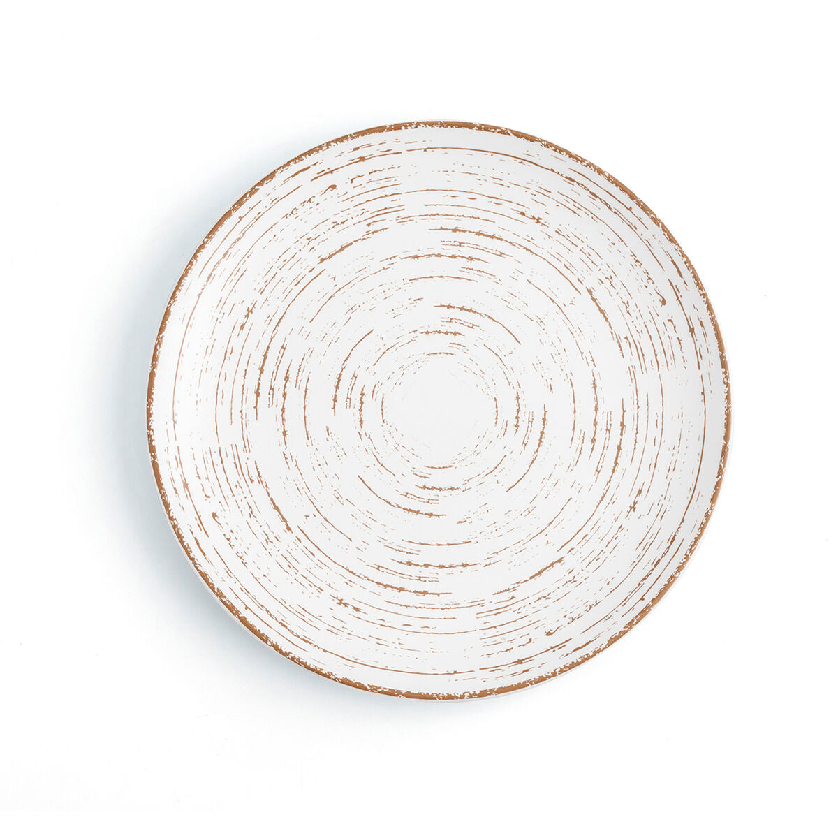 12 osan setti keraamisia litteitä lautasia halkaisijaltaan noin Ø 21 cm. Ajaton kaksivärinen pinta yhdistää valkoisen keskustan ja rustiikkisen ruskean reunakuvion, mikä tuo lämpöä ja tekstuuria kattaukseen. Sopii arkeen, juhlaan sekä kahviloiden ja pienten ravintoloiden pöytiin.