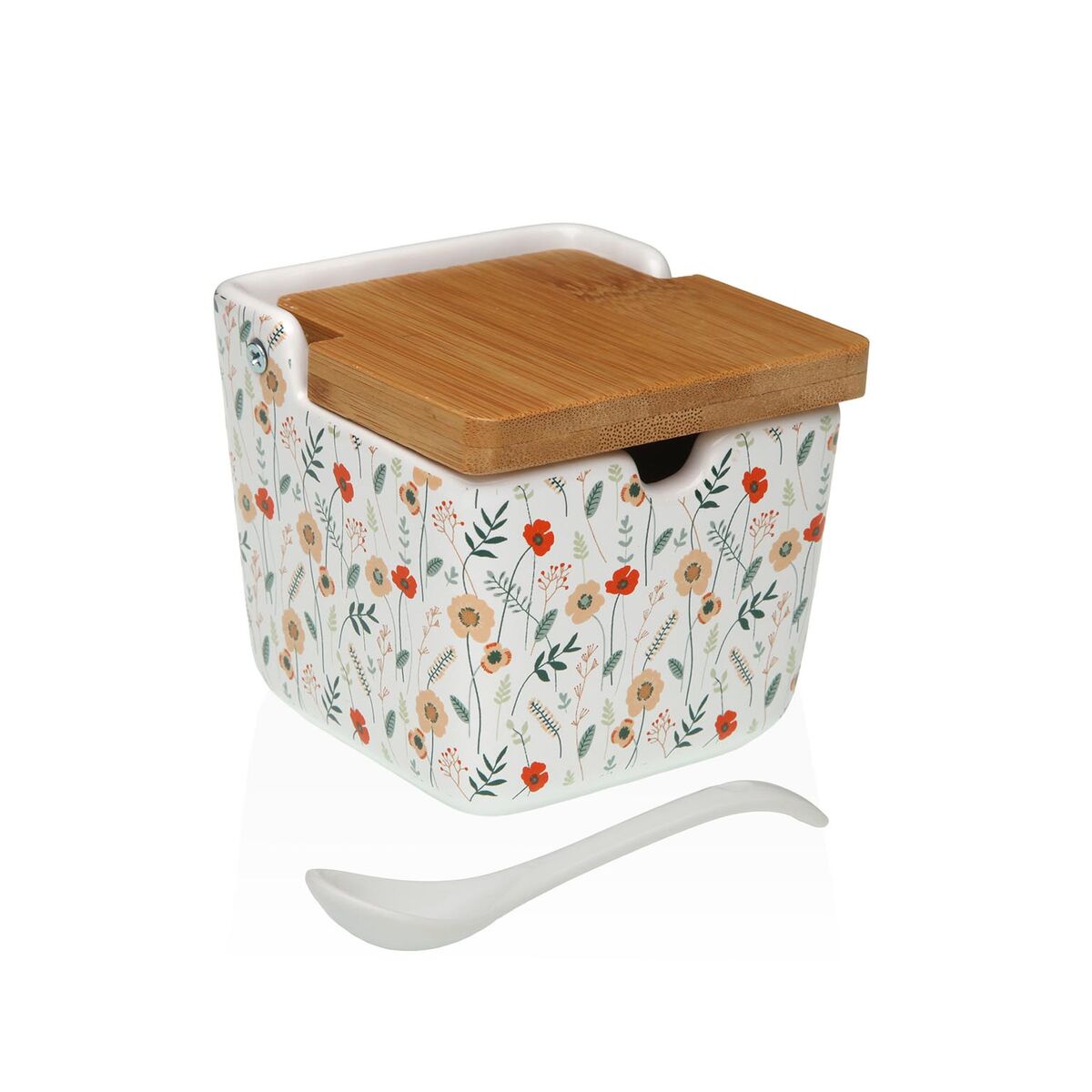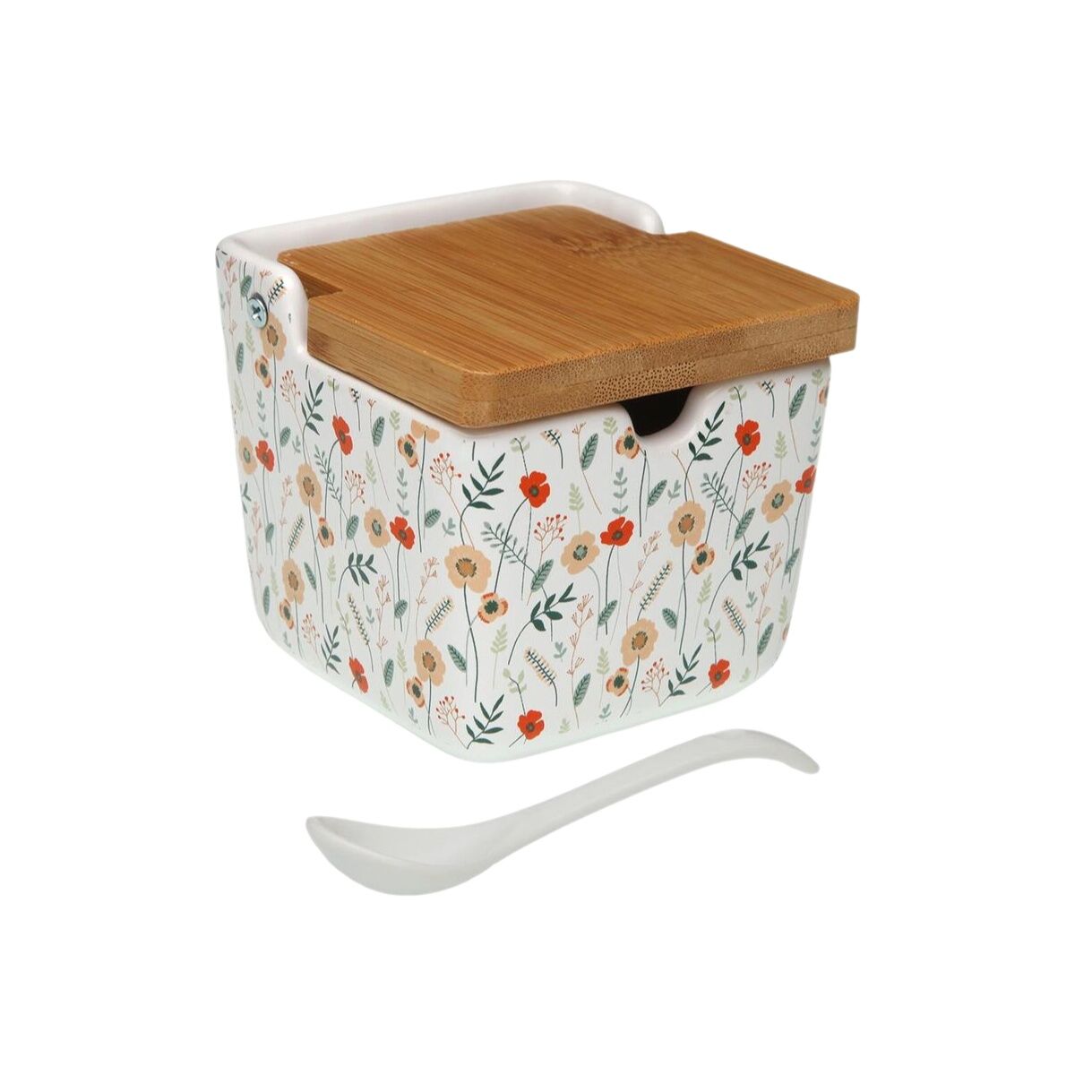 Suloinen keraaminen sokeriastia kukkakuviolla ja bambukannella. Kompakti koko sopii kahvipöytään, teehetkiin ja pikkukeittiöihin.