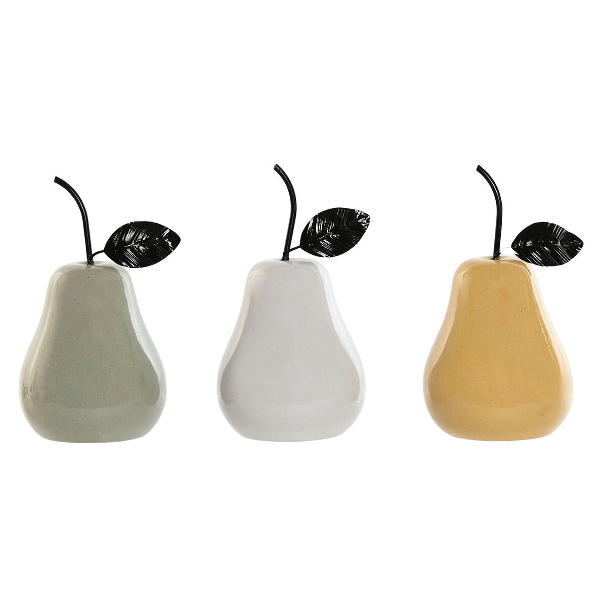 Kolmen koristepäärynän setti posliinia ja metallia, modernilla päärynämuodolla ja kiiltävällä posliinipinnalla. Toimii sisustuskoristeena pöydälle, hyllylle tai ruokailutilaan ja tuo raikkaan väripisteen kotiin.