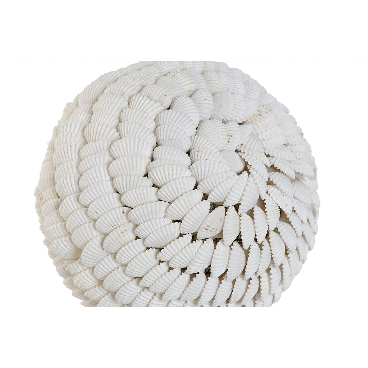Valkoinen käsintehty koristepallo, päällystetty pienillä simpukankuorilla. Pyöreä koristekuula on noin 12 × 12 × 12 cm ja sopii pöydälle, hyllylle tai merihenkiseen sisustukseen.