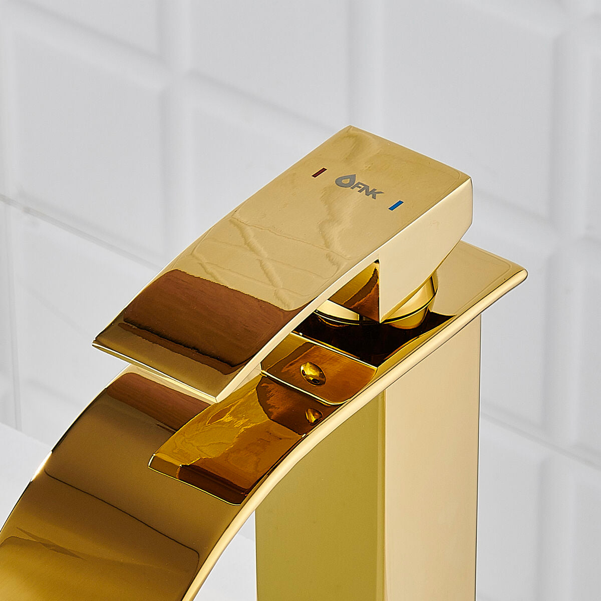 Korkea kultainen sekoitushana pesuallaspäivitykseen. Seinään asennettava sekoitushana yhdistää modernin, suoraviivaisen runkoratkaisun ja leveän kaarevan juoksuputken, joka luo näyttävän vesilammikon ja sopii erityisesti korkeille malja- ja korokepesualtaisiin.