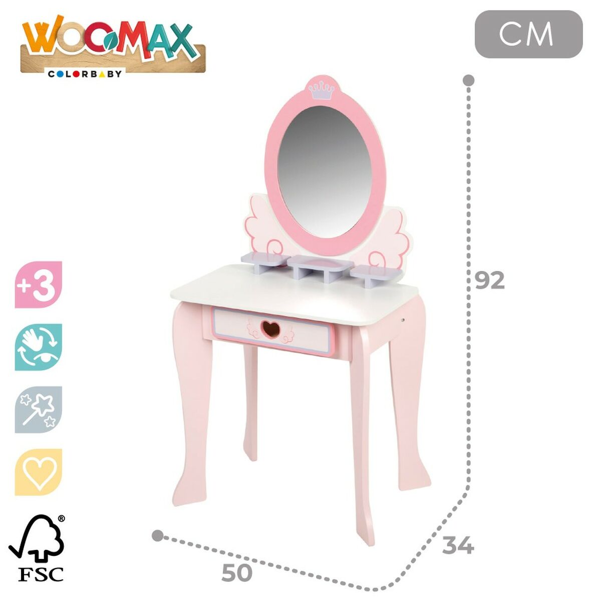 - Vetolaatikko: pieni säilytystila pitää leikkikosmetiikan ja asusteet järjestyksessä.