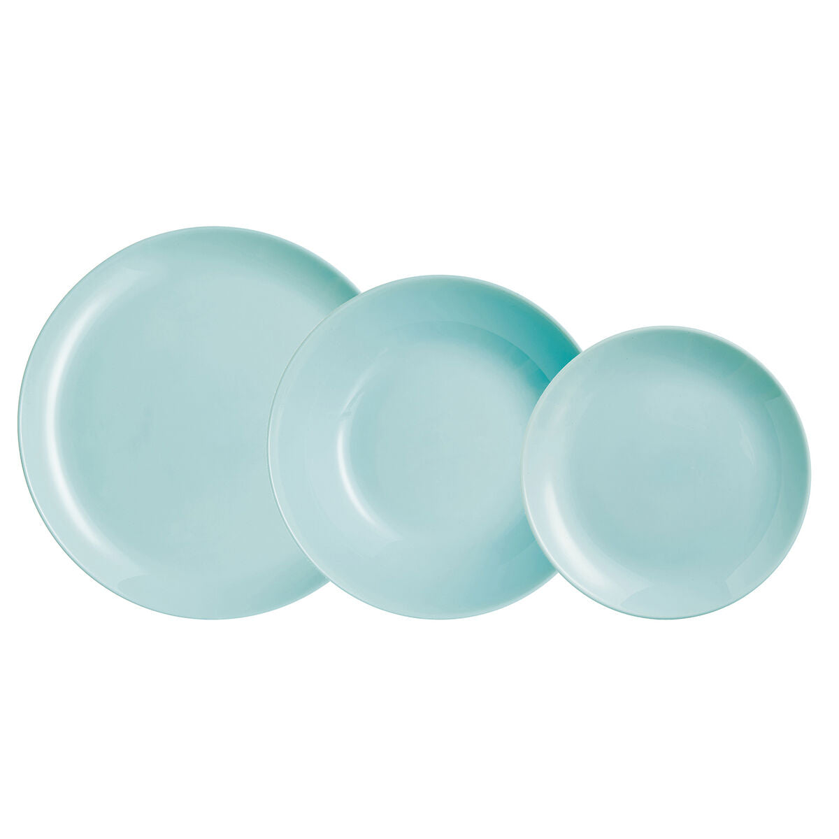 Diwali Turquesa 18-osainen lasinen lautasetti turkoosin sävyllä. Monipuolinen astiasto arkeen ja juhlaan, joka antaa raikkaan ilmeen kattaukseen.