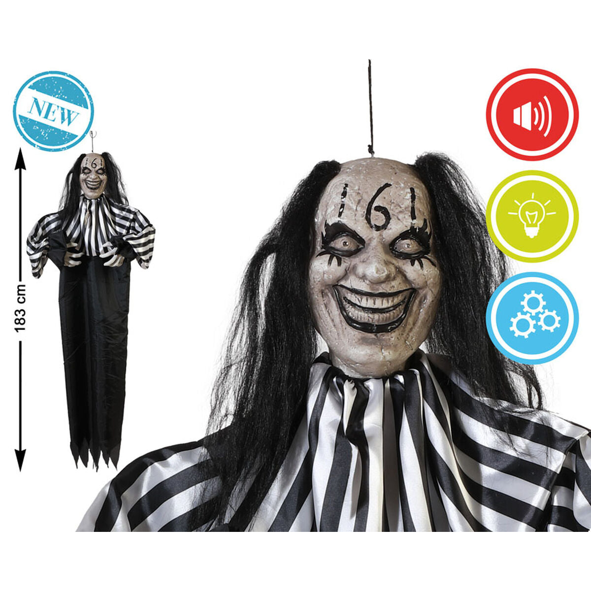 Liikkuva halloween-koriste 153 x 135 x 15 cm — pelottava miesklovni, jossa on ääni-, valo- ja liiketoiminnot. Tehosta halloween-tunnelmaa tai teemajuhlia näyttävällä kauhufiguurilla, joka kiinnittää huomion ja luo pelottavan efektin.