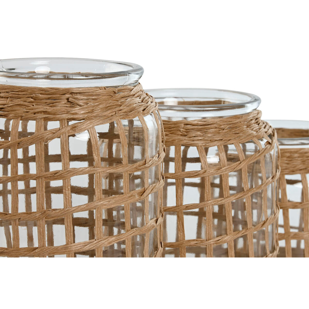 Kolmen maljakon setti, jossa kirkas kristallilasi yhdistyy luonnonväriseen kuitupunokseen. Avoin ruudukkomainen punos antaa maljakoille ilmavan, boheemin ilmeen ja sopii niin moderniin kuin rustiikkiseen sisustukseen.