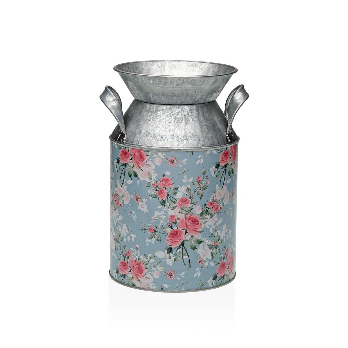 Metallimaljakko kukkakuosilla tuo maalaisromanttista ilmettä kotiin. Vaaleansininen pohja ja vaaleanpunaiset ruusukuvioinnit yhdistyvät hopeanharmaaseen yläosaan ja kahvoihin, jolloin maljakko sopii sekä moderniin että perinteiseen sisustukseen.