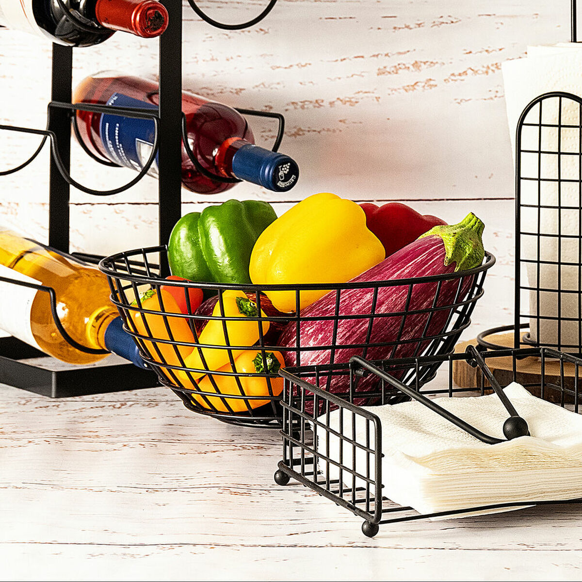 Metallinen hedelmäkulho mustassa ritilämuodossa. Avoin ja ilmava design tekee hedelmistä näyttäviä ja pitää ne tuuletettuina. Sopii keittiön tasolle, ruokapöydälle tai tarjoiluun.
