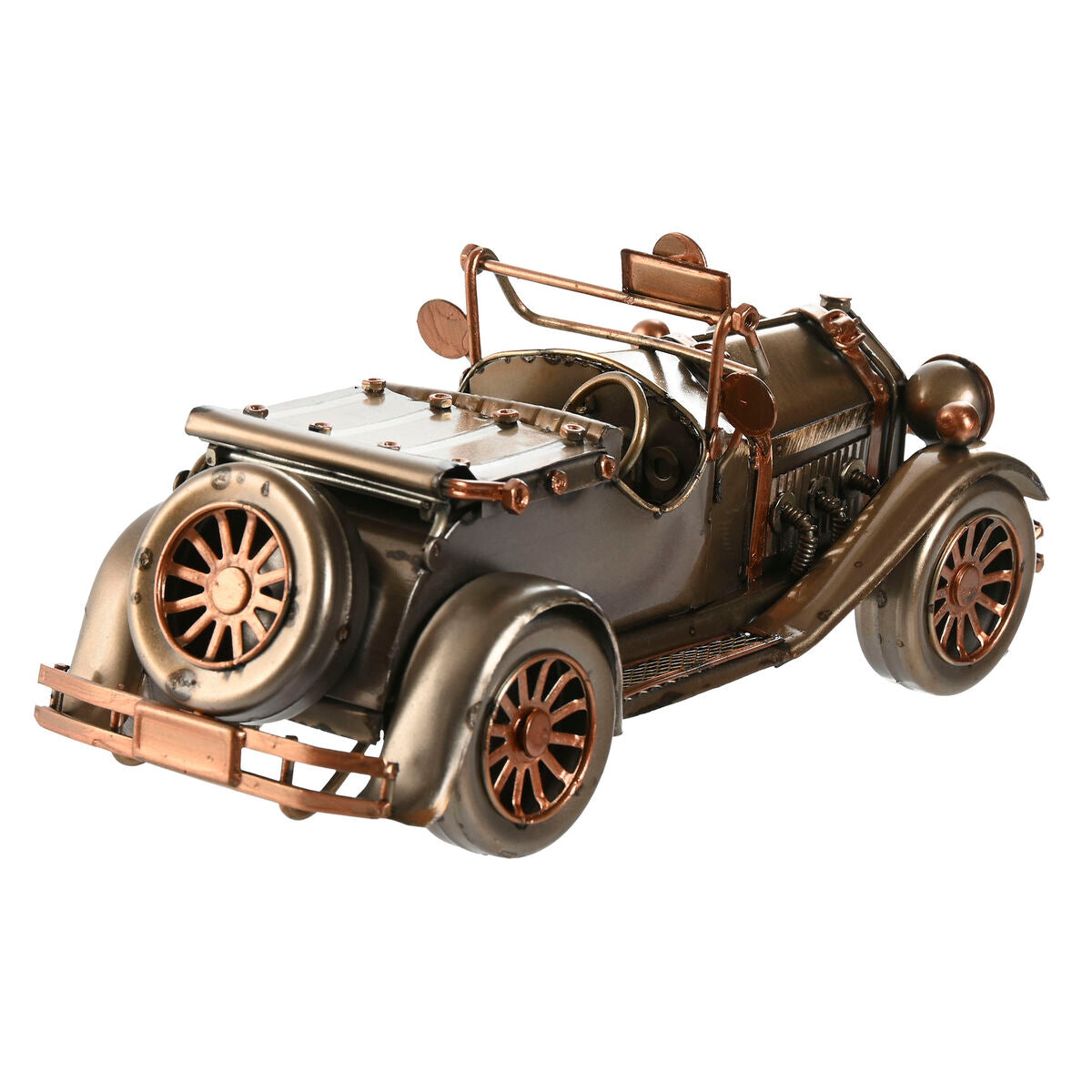 Metallinen vintage-tyylinen koristeauto kullatulla ja hopeisella viimeistelyllä. Täydellinen pöytä- tai hyllykoriste, joka tuo retrohenkistä ilmettä kotiin, toimistoon tai autotunnelmaiseen sisustukseen.