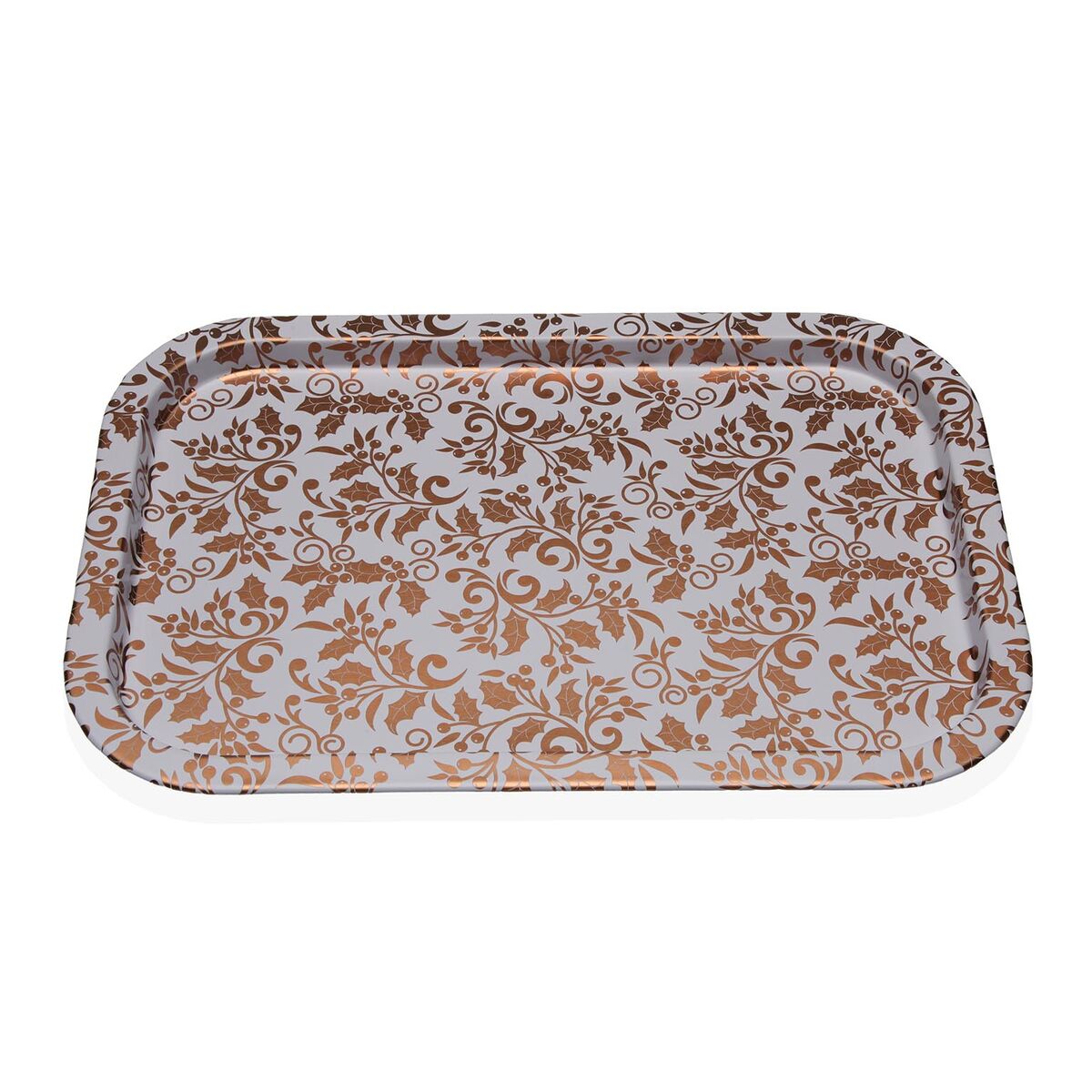 Metallinen, kulta-kuvioitu tarjotin 23 x 1,5 x 34 cm. Elegantti valkoinen pohja ja koristeellinen kultainen lehti-/kasvikuosi tuovat juhlavuutta kattaukseen. Sopii pikkupurtaville, leivoksille ja juomille sekä koristekäyttöön.
