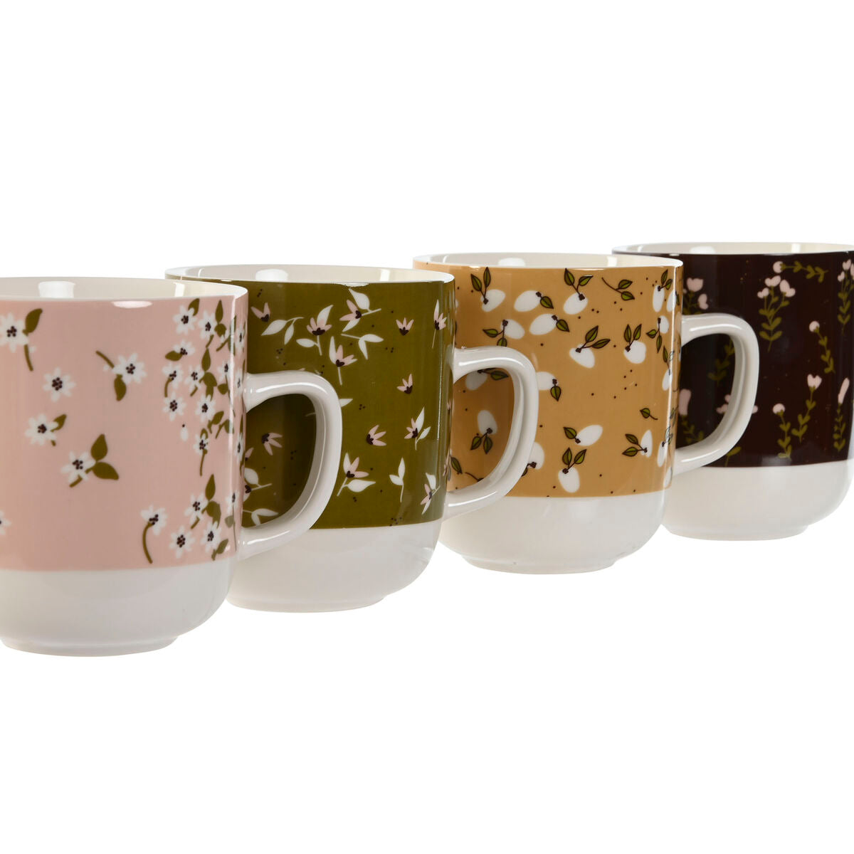 Kukkakuvioiset posliinimukit, 4 kpl, tilavuus 380 ml. Monivärinen setti sisältää ruskean, vihreän, pinkin ja sinapin sävyt, jotka tuovat lämpöä ja iloa kahvi- ja teehetkiin. Mukit on valmistettu posliinista ja niissä on selkeä, moderni kuosi sekä valkoinen alaosa.