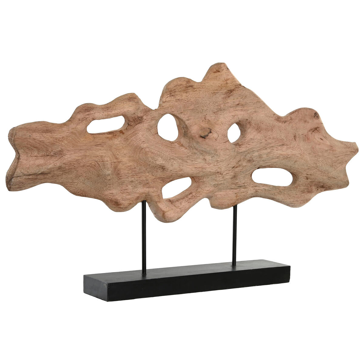 Koristehahmo puuveistos mango-puusta, tuettu mustalla rautajalustalla. Luonnollinen, orgaaninen muoto ja vaalea puunsävy toimivat näyttävänä pöytäkoristeena tai hyllyveistoksena modernissa sisustuksessa.