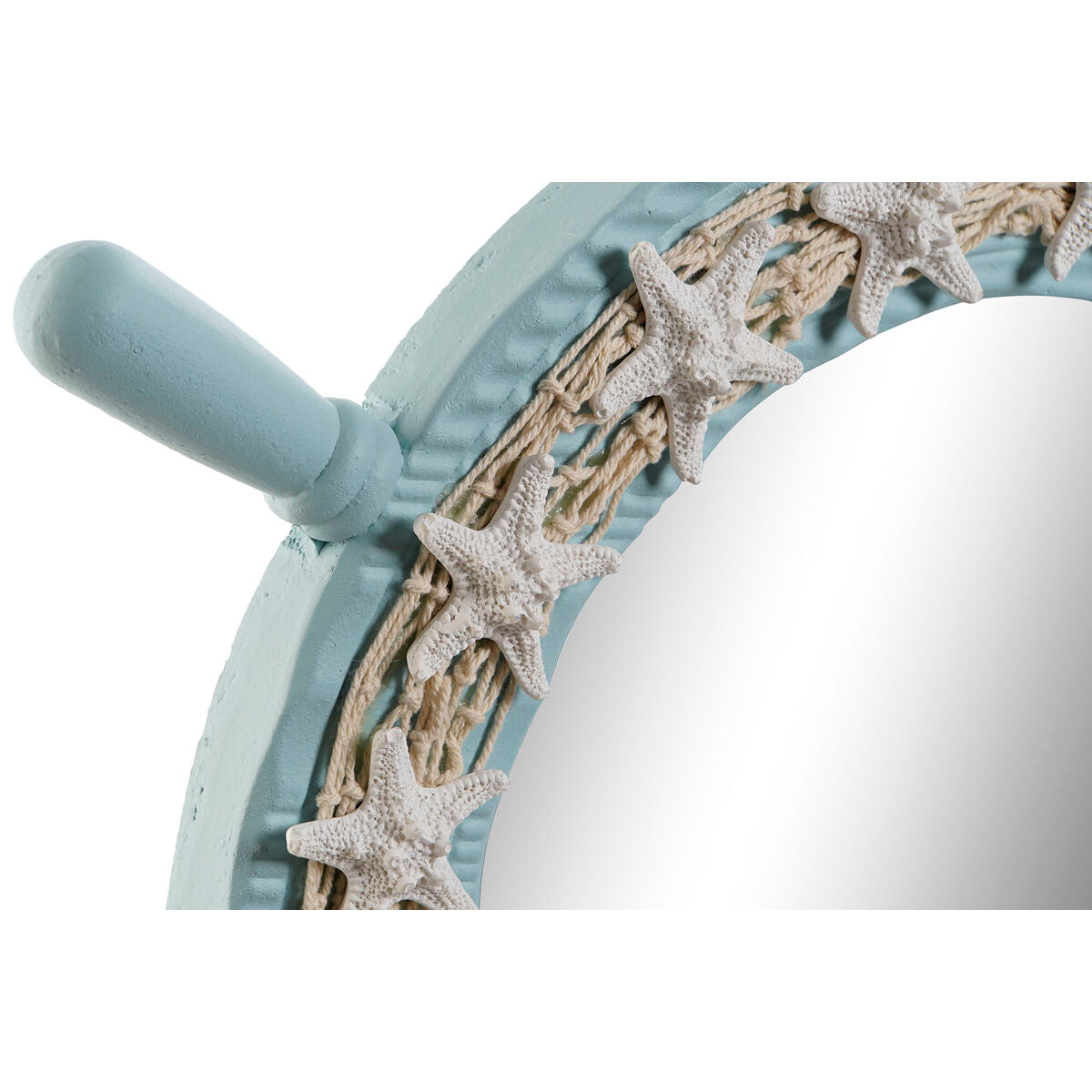 Pyöreä seinäpeili, käsintehty puu- ja köysikehyksellä, tuo Välimeren merihenkisen ilmeen kotiin. Taivaansininen ruorimainen kehys ja koristeelliset meriaiheet tekevät peilistä näyttävän seinäkoristeen.