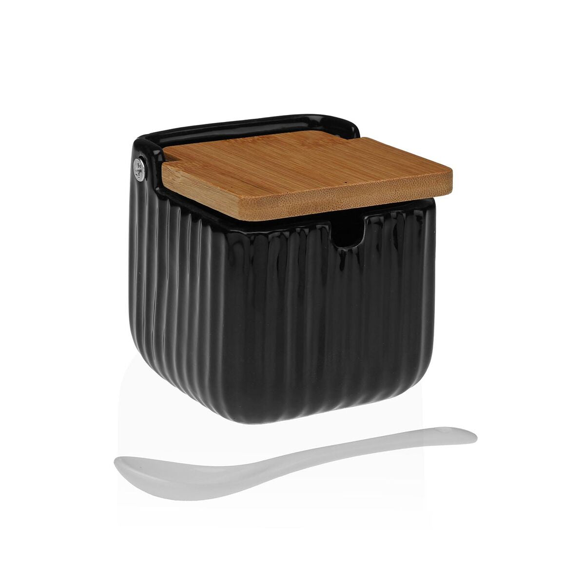 Sokeriastia bambukannella, musta raitapintainen sokeripurkki keittiöön ja kahvipöydälle. Yhdistää dolomiitin/keramiikan kestävyyden ja bambukannen luonnollisen ilmeen. Sopii sekä arkeen että tarjoiluun.