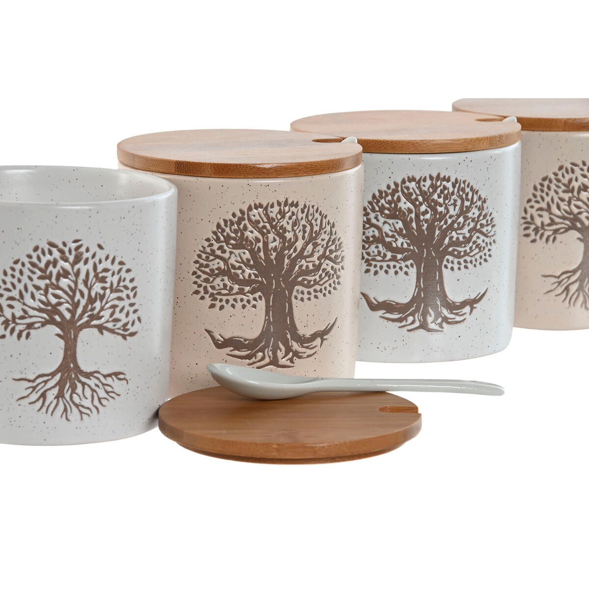 Neljä kappaletta sokeriastioita keramiikasta, bambukansilla ja elämänpuu-kuviolla. Käytännöllinen ja koristeellinen setti kahvipöytään, keittiöön tai lahjaksi. Sopii sokerin lisäksi pienille kuivatuotteille.