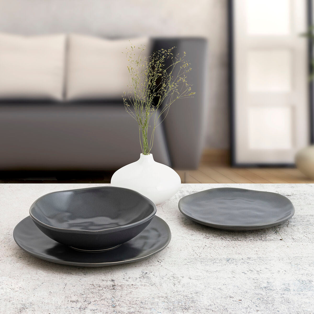 Syvä lautanen Ø 22 cm keraamisesta Bidasoa Cosmos -sarjasta. Myydään 12 kappaleen pakkauksena. Hillitty mustanharmaa/musta lasite ja kevyesti epäsymmetrinen reuna luovat ajattoman ilmeen arkeen ja tarjoiluun.