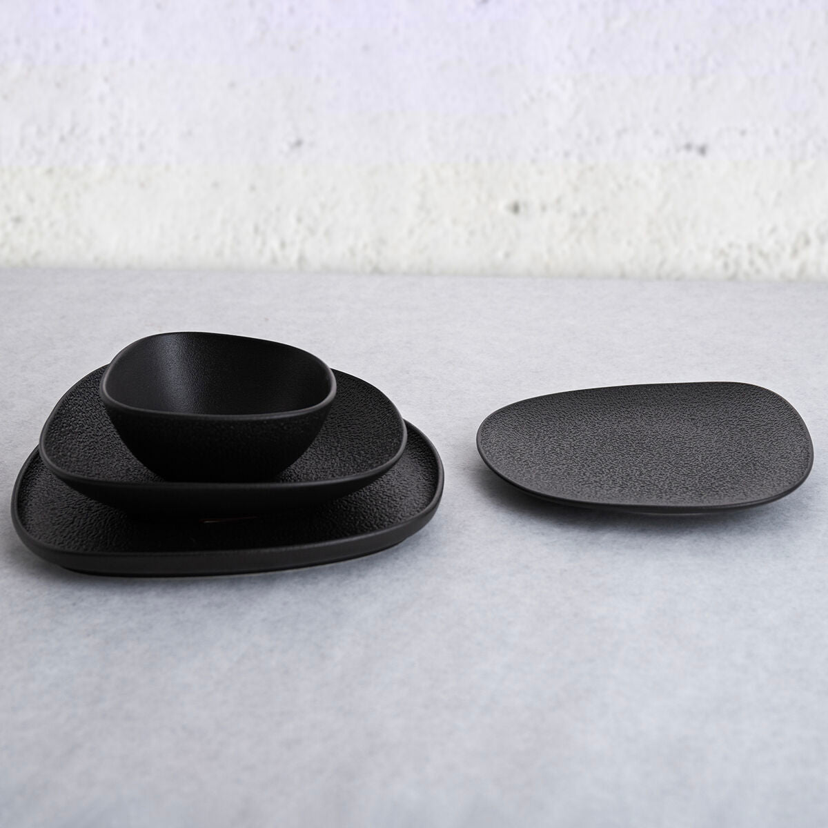 Syvä lautanen musta keramiikka neliömuotoisella, teksturoidulla mattapinnalla. Mitat noin 21,9 × 21,7 × 4,8 cm, pakkauksessa 6 kpl. Tämä syvä lautanen sopii arkeen ja tarjoiluun: keitot, pastat, salaatit ja muut annokset näyttävästi esille.
