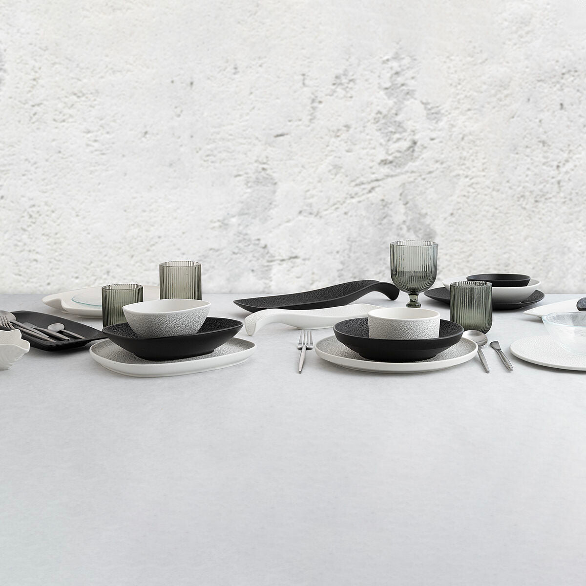 - Teksturoidtu mattapinta — eläväpintainen ulkonäkö, tuo kontrastia ja korostaa tarjoiltavia ruokia.